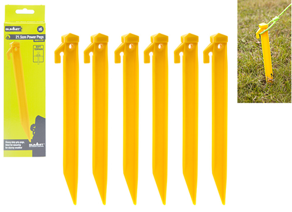 Six durable power pegs for additional support with groundsheets and tents. The bright colour and compact cap maximises safety on campsites.