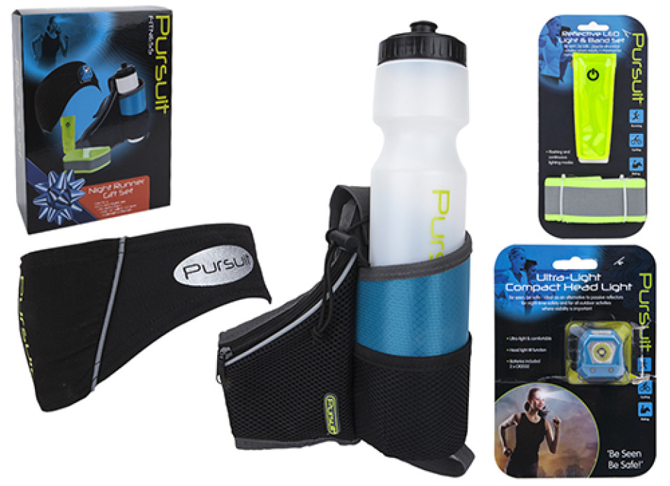 Night Runner gift set comprising reflective LED light band. Waist belt, bottle & micro towel. Lightweight LED headlight.
