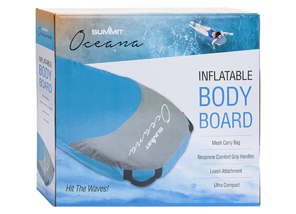 Oceana inflatable bodyboard in Blue. Complete with ankle leash and mesh carry bag. Easy to inflate and deflate.